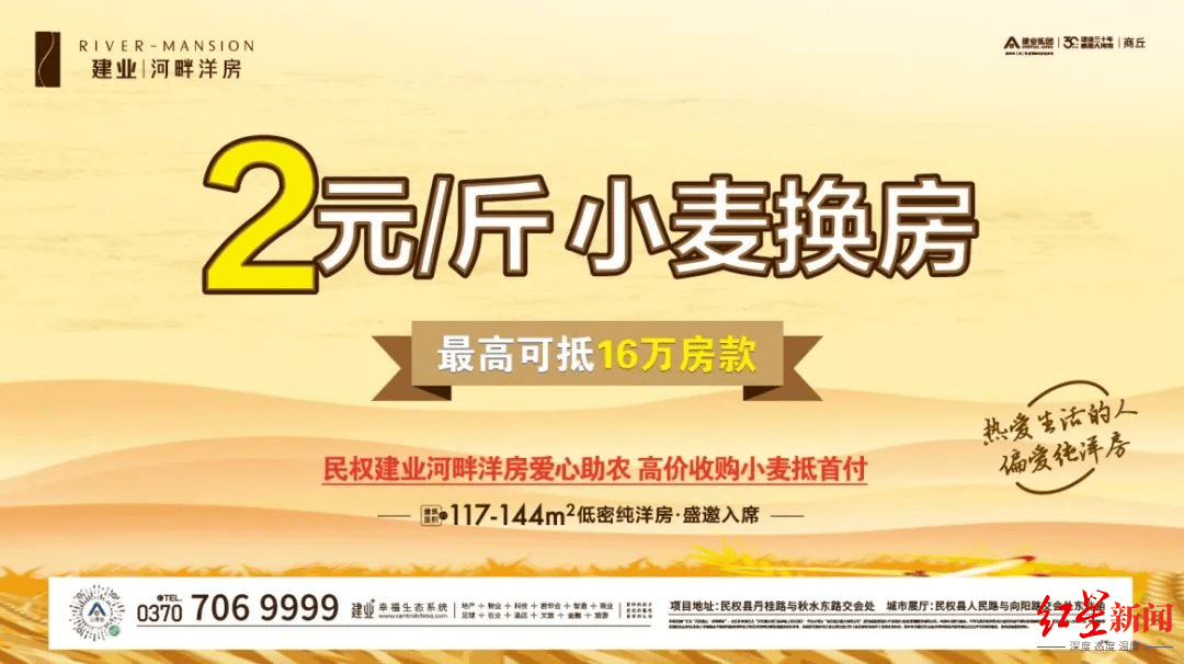 据红星新闻此前报道,今年6月20日河南商丘市民权县的“建业河畔洋房”推出了“小麦换房”活动,收购价2元/斤,比市场价高出5毛钱左右,用小麦最高可换16万元。该活动原计划今年7月10日结束,推出两天来,已有三四个意向客户看过房,还没有具体成交。