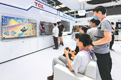 在广州市举行的超高清视频产业创新产品技术交易展现场,参加电竞大赛的选手体验超高清电竞智屏。 |