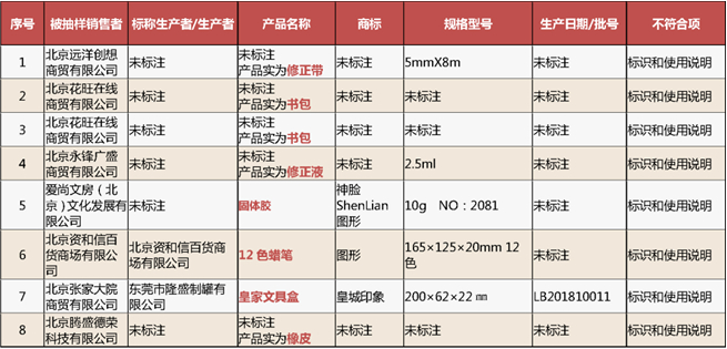 据悉,北京市市场监督管理局近期依法对全市生产、销售的学生用品开展了质量监督抽查。按照相应产品质量监督抽查实施细则和相关标准,检出8组批产品不合格,存在的主要质量问题是学生用品的标识和使用说明项目不符合标准要求。