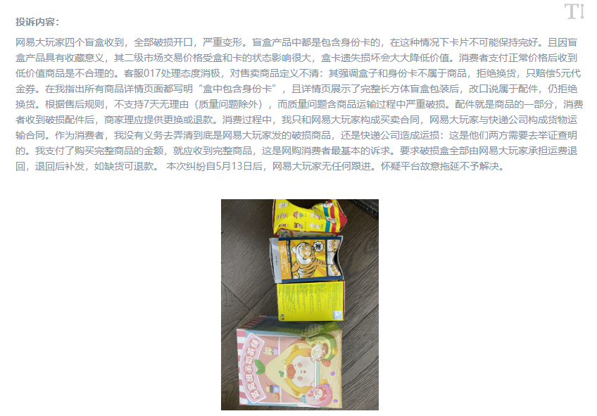 今年5月,在人民网“人民投诉”平台上,一位网友“吐槽”了自己购买盲盒时遇到的“糟心事”,其表示自己在某平台购买了盲盒玩具,收到时却发现商品破损,但商家不同意更换,并故意拖延不予解决。