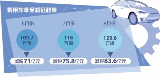 统计显示,6月份,109.7万辆乘用车享受减征政策,减税71亿元;7月份116万辆,减税75.8亿元;8月份129.6万辆,减税83.6亿元。3个月以来,享受政策的车辆数、减征税额均呈现逐月增长态势,显示出减征政策逐步发力、受益面稳步扩大。特别是8月份减税额和享受优惠的车辆环比增幅均超10%,分别为10.3%、11.7%。