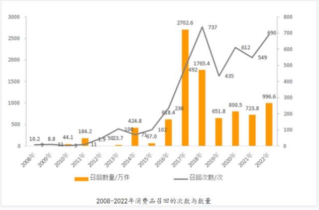 2022年,我国共实施消费品召回690次,涉及产品996.6万件,缺陷调查仍是推动消费品企业实施召回的主要方式;召回产品主要集中在家用日用品、电子电器、儿童用品及食品相关产品;标准符合性问题是主要原因。
