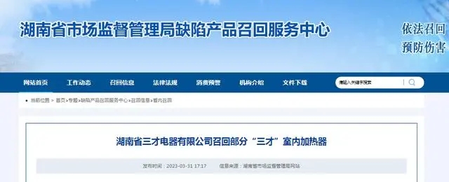日前,湖南省三才电器有限公司按照《消费品召回管理暂行规定》的要求,主动向湖南省市场监督管理局报告了召回计划,将自即日起,召回2022年9月期间制造的“三才”牌NSB-90型号室内加热器,涉及数量为1723台。