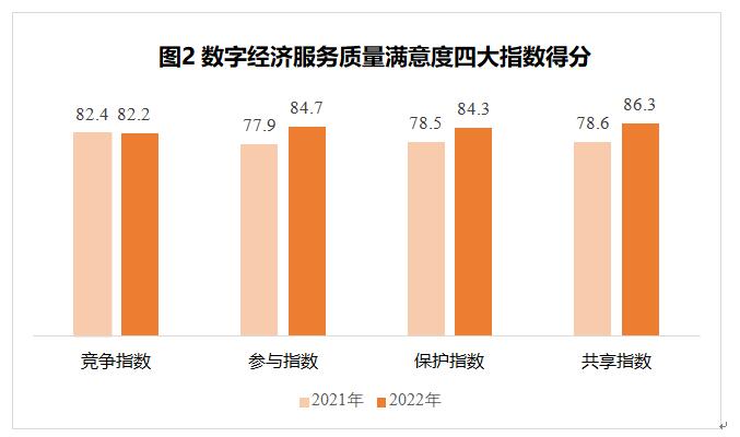 此次调查显示,数字经济竞争指数为82.2分,同比下降0.2分。消费者对网络覆盖、基础设施、宽带速率和消费设施的评价较高,得分均超过80分,但对服务能力评价较低,即当前数字经济发展的硬件设施已获得消费者认可,但供给质量滞后于供给数量的发展。数字经济催生了众多新职业,对劳动知识结构、专业技能提出了更高要求。技术创新同比下降0.3分,消费者认为当前数字经济关键领域创新能力不足,尤其在操作系统、高端芯片等方面落后于国际先进水平。随着生活品质提高,消费者对数字产品创新需求也在与日俱增,需进一步加快创新力度,不断追赶消费者持续提升的需求。