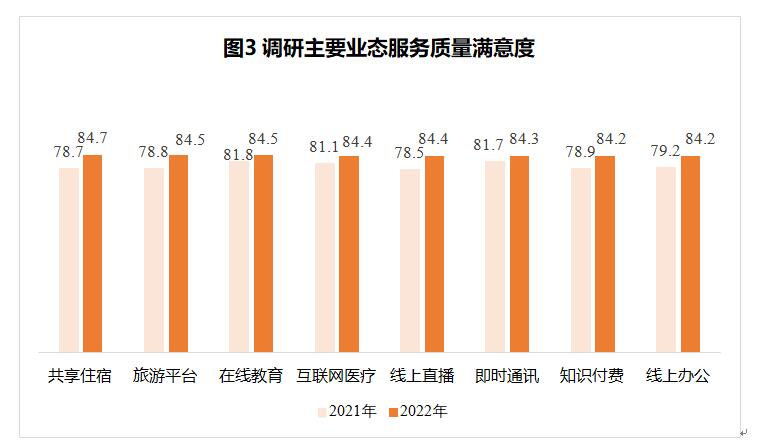 调查结果显示,本年度调查的16个业态中,得分排名前八位的是:共享住宿、旅游平台、在线教育、互联网医疗、线上直播、即时通讯、知识付费、线上办公。近年来,数字经济服务各领域竞争激烈,市场格局加速重塑,倒逼服务供给方持续提升产品和服务表现;其次,市场秩序不断规范,数字经济企业合规水平持续提升,确保了主要业态规范发展。