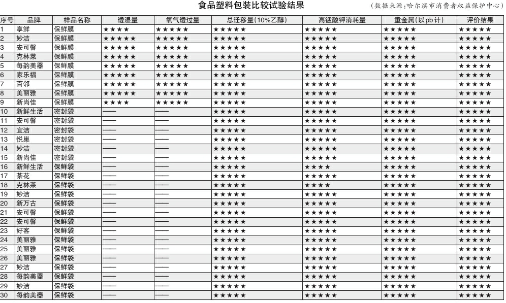 本报哈尔滨讯(记者刘传江)近日,黑龙江省哈尔滨市消费者权益保护中心对食品塑料包装产品(食品保鲜膜、食品保鲜袋、食品密封袋)进行了比较试验,30款样品均符合国家标准。