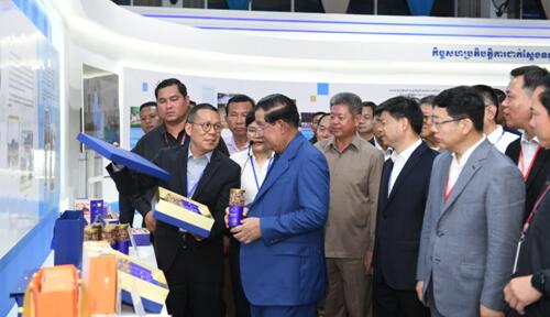 洪森首相在慰问完区内员工后,和王文天大使一同参观了共建“一带一路”倡议十周年西港特区成果展,认真听取了西港特区公司董事长陈坚刚关于特区发展巨变的介绍。