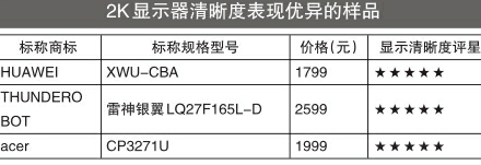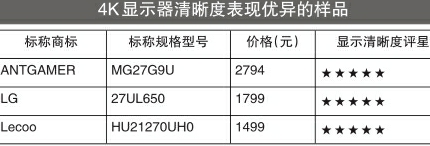综合来看,有6款显示器样品在显示清晰度方面表现优异,获得5星。其中,4K显示器清晰度表现优异的样品包括ANTGAMER(标称规格型号:MG27G9U)、LG(标称规格型号:27UL650)、Lecoo(标称规格型号:HU21270UH0);2K显示器清晰度表现优异的样品包括HUAWEI(标称规格型号:XWU- CBA)、THUN?DEROBOT(标称规格型号:雷神银翼LQ27F165L)、acer(标称规格型号:CP3271U)。