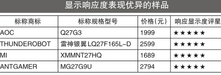 综合来看,有4款显示器在显示响应度方面表现优异,分别是AOC(标称规格型号:Q27G3)、THUN?DEROBOT(标称规格型号:雷神银翼LQ27F165L-D)、MI(标称规格型号:XMMNT27HQ)、ANTGAMER(标称规格型号:MG27G9U)。