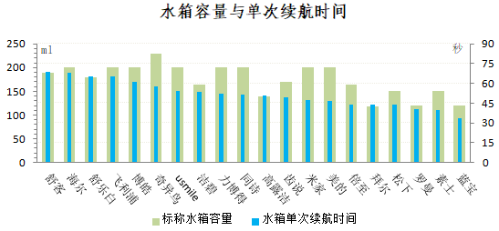 冲牙过程中反复加水会影响使用体验。本次样品水箱容量均在118—230ml之间。测试发现,水箱容量大不等于续航时间长。标准冲洗模式下,水箱单次续航时间在33.8—68.5秒之间,有5款可使用超过1分钟,如标称商标为舒客(规格型号:H5)的样品。20款冲牙器中,水箱单次续航时间最短的33.8秒,为标称生产商/制造商为广东蓝宝智能科技有限公司、标称商标蓝宝(规格型号:CY02)的样品。