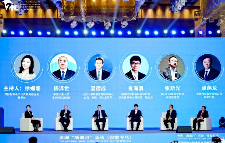 在专家对话环节,国际标准化杰出贡献奖基金会秘书长徐姗姗与中国计量大学北京研究院院长杨泽世,山东大学质量管理研究中心主任、教授、博士生导师温德成,中国检验检疫科学研究院综合检测中心研究员、副主任肖海清,ULSE标准开发机构中国区经理张斯光展开对话,基于业界关注重点热点、质量提升的难点堵点等,共同为制造业发展建言献策。