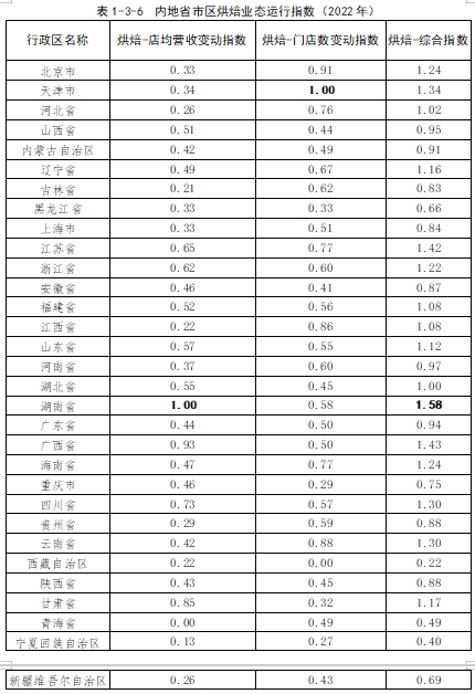 烘焙业与茶饮业呈现明显的增长态势,店均营收同比变动均有较大幅度上涨。茶饮店均营收增长最高的地区是新疆,茶饮门店数增长最多的是山西。烘焙店均营收增长最多的省份是湖南,烘焙门店数增长最多的是天津。综合来看,烘焙发展和增长最快的是湖南,综合发展指数为1.58。