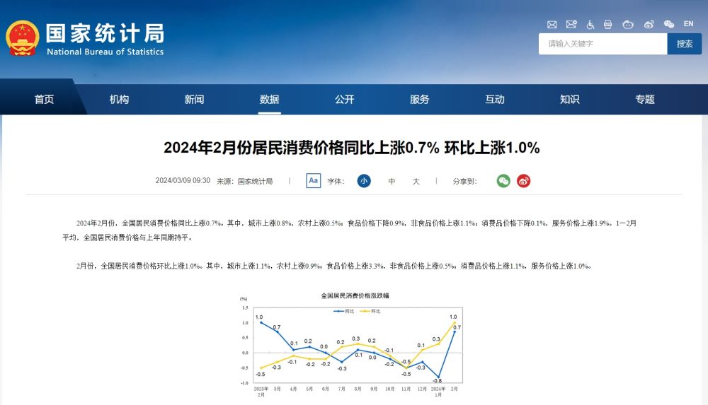 2024年2月份,全国居民消费价格同比上涨0.7%。其中,城市上涨0.8%,农村上涨0.5%;食品价格下降0.9%,非食品价格上涨1.1%;消费品价格下降0.1%,服务价格上涨1.9%。1—2月平均,全国居民消费价格与上年同期持平。