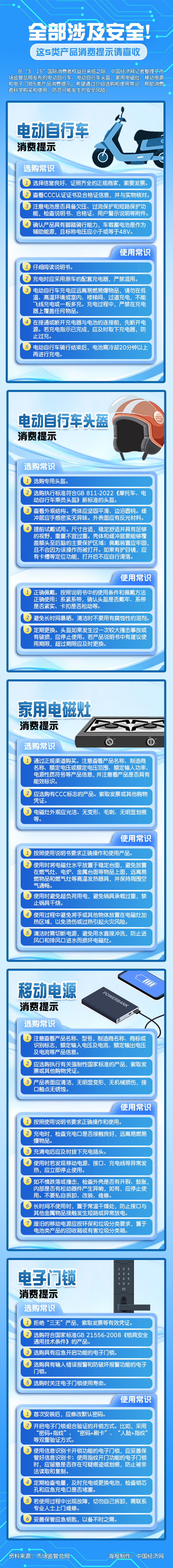 在“3·15”国际消费者权益日来临之际,中国经济网记者整理了市场监管总局发布的电动自行车、电动自行车头盔、家用电磁灶、移动电源和电子门锁5类产品消费提示。希望通过介绍选购和使用常识,帮助消费者科学购买和使用,防范可能发生的安全风险。(中国经济网记者 佟明彪)
