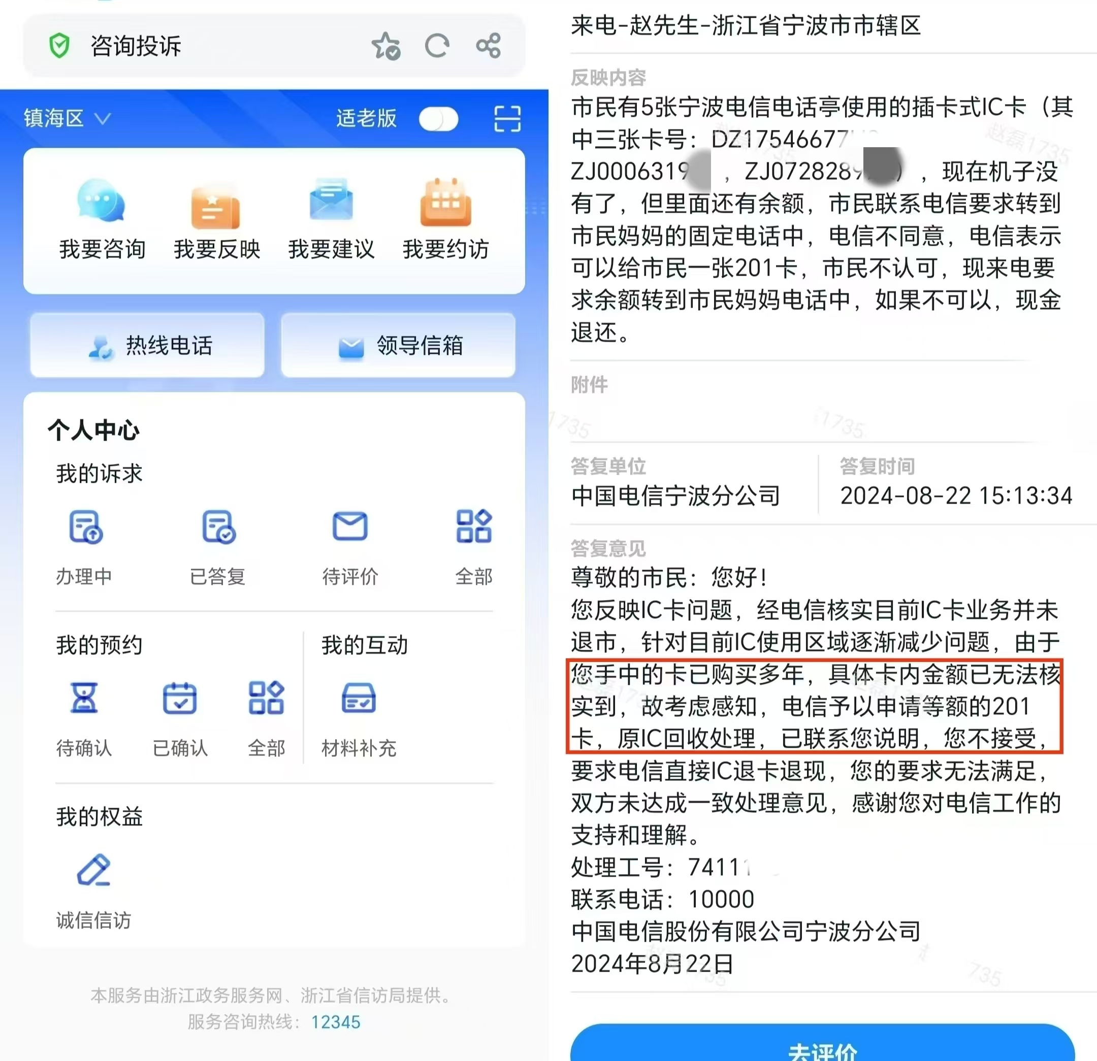 “换卡我也用不上啊。”赵先生说。无奈之下,他通过12345热线进行了投诉。8月22日,中国电信股份有限公司宁波分公司回复赵先生:“目前IC卡业务并未退市,针对目前IC(卡)使用区域逐渐减少问题,由于您手中的卡已购买多年,具体卡内金额已无法核实到,故考虑感知,电信予以申请等额的201卡,原IC回收处理,已联系您说明,您不接受,要求电信直接IC退卡退现,您的要求无法满足,双方未达成一致处理意见……”