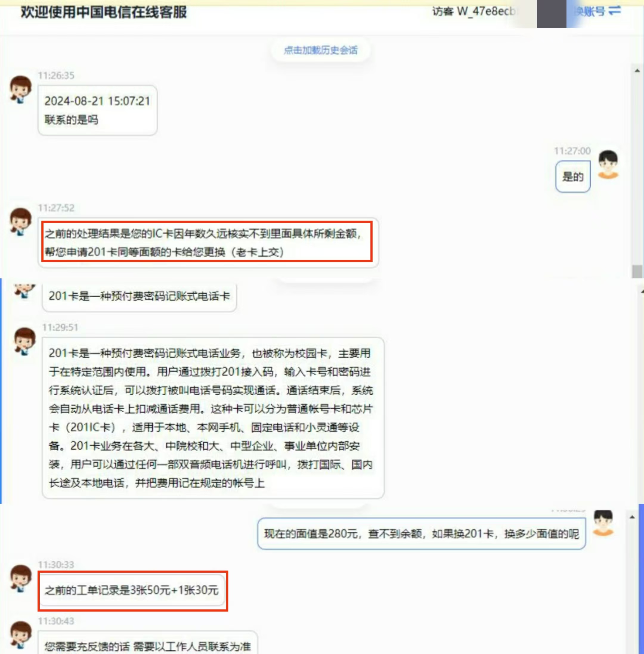 随后,记者联系中国电信浙江宁波在线客服咨询赵先生反映情况的处理结果。客服人员回复:“IC卡因年数久远核实不到里面具体所剩金额,申请201卡同等面额的卡更换(老卡上交)。”记者询问具体换多少面值金额的201卡,客服人员表示:“之前的工单记录是3张50元+1张30元……”