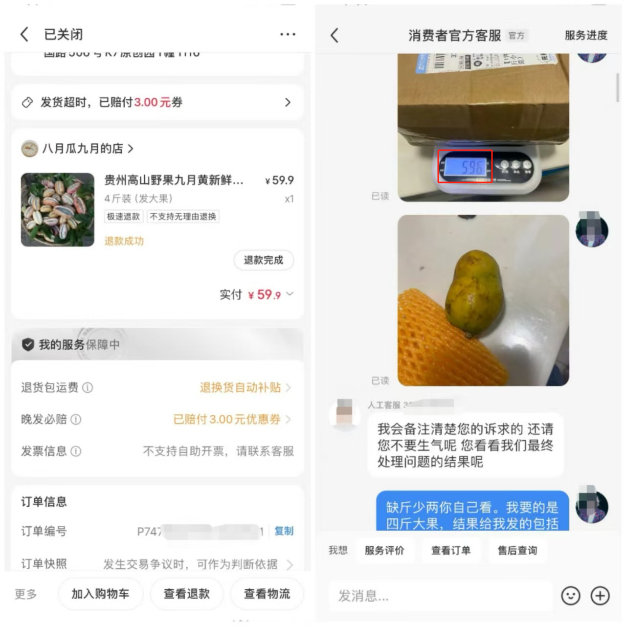 “我11月20日花费59.9元网购了名为‘4斤装(发大果)’的九月黄瓜果,收到货感觉比较轻就去称重,发现连同快递纸盒一共只有1斤多,拆开包裹后有5个果子,其中3个比较小。”浙江杭州消费者徐女士告诉《中国消费者报》记者,她11月25日先联系商家但一直未获回复,于是向平台客服发送了称重显示为596g的图片等证据,审核通过后收到了退款。