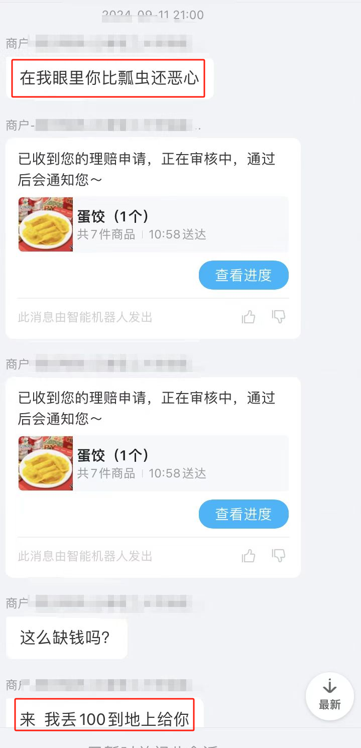 湖南省长沙市消费者罗先生对记者说:“9月11日,因外卖中存在虫子的问题联系商家理赔,却遭到了对方的私信辱骂和嘲讽。”罗先生提供的他与商家的聊天记录显示,商家表示“在我眼里你比瓢虫还恶心”“这么缺钱吗?”“来,我丢100元到地上给你” “我一天的营业额是你一个月的工资,只是看不惯你们那嘴脸”。