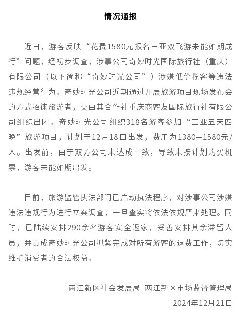 据通报,经初步调查,涉事公司奇妙时光国际旅行社(重庆)有限公司(以下简称“奇妙时光公司”)涉嫌低价揽客等违法违规经营行为。奇妙时光公司近期通过开展旅游项目现场发布会的方式招徕旅游者,交由其合作方重庆商客友国际旅行社有限公司组织出团。奇妙时光公司组织318名游客参加“三亚五天四晚”旅游项目,计划于12月18日出发,费用为每人1380至1580元。出发前,由于双方公司未达成一致,导致未按计划购买机票,游客未能如期出发。