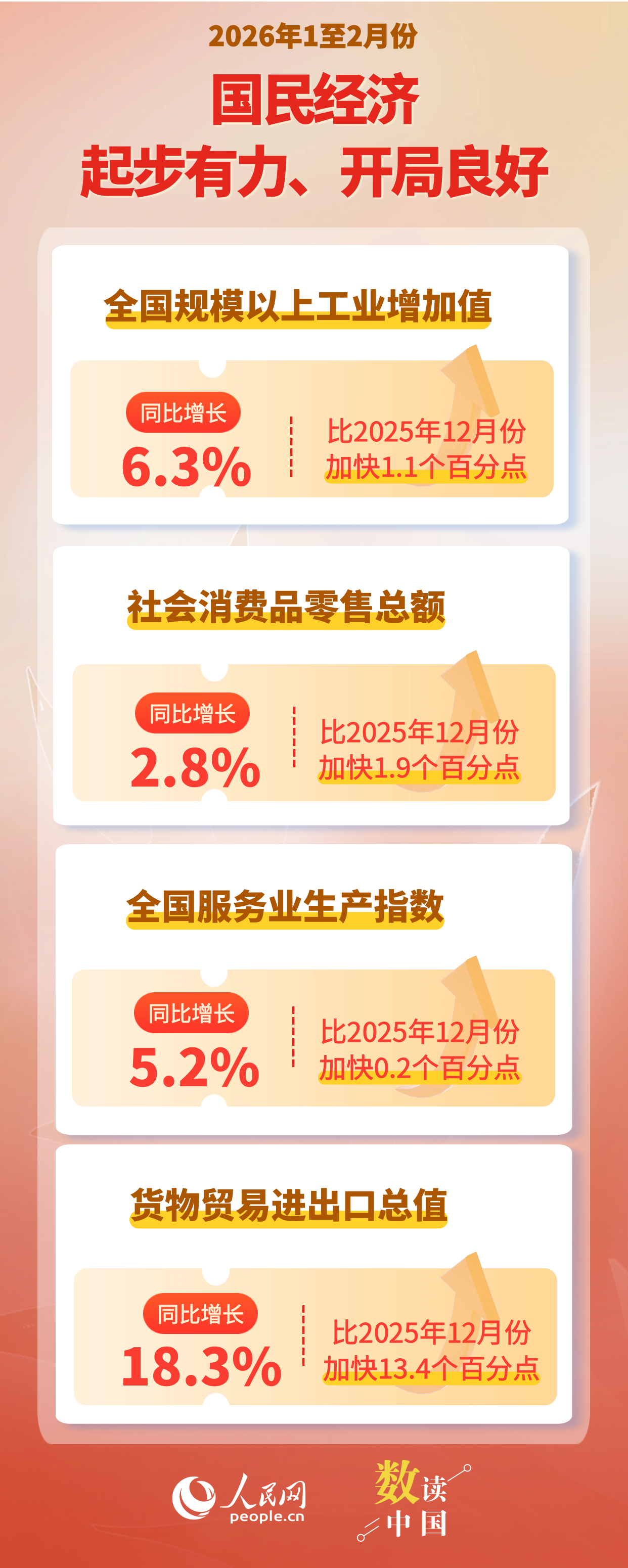 人民网北京3月16日电 (记者杨曦)国家统计局16日公布多项数据显示,1—2月份,生产供给增长加快,市场需求稳中有升,就业物价总体稳定,新质生产力成长壮大,经济运行起步有力,实现良好开局。
