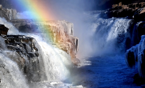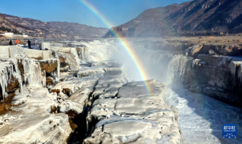 近日,随着气温骤降,黄河壶口瀑布呈现出别样奇观:飞溅的浪花,在两岸崖壁之上凝固成巨大冰瀑,点缀着一条条银装素裹的冰柱,玲珑剔透,错落有致;激起的水雾,在阳光的映射下,彩虹横亘其间,宛如一幅幅画卷。