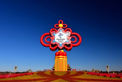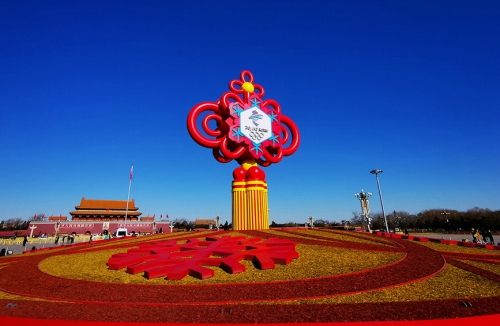 2022年1月17日,北京冬奥会日益临近,“精彩冬奥”主题花坛装点天安门广场。宋晓峰 摄(视觉中国)