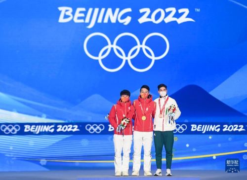 当日,北京2022年冬奥会短道速滑男子1000米奖牌颁发仪式在北京赛区颁奖广场举行。