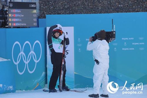 人民网北京2月8日电2月8日上午,在北京2022年冬奥会自由式滑雪女子大跳台决赛中,中国选手谷爱凌夺得金牌,这是中国在冬奥会女子雪上项目上的首枚金牌。法国选手泰丝·勒德获得该项目银牌,瑞士选手玛蒂尔德·格雷莫德获得铜牌。(人民网记者 胡雪蓉 摄影报道)