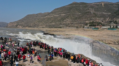 随着气温不断回升,黄河壶口瀑布水流量明显增大,在阳光的照射下,飞瀑与彩虹相映成趣,把一幅动静结合的春天画卷展现在游客眼前。新华社记者 陶明 摄