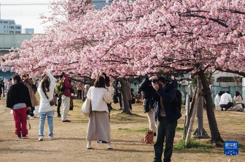 3月9日,人们在日本东京旧中川沿岸欣赏绽放的樱花。近日,日本东京气温渐暖,樱花绽放。新华社记者 张笑宇 摄