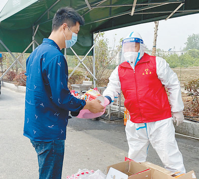 “李师傅,一路辛苦了!”身着防护服的季勇兵热情地打着招呼,通过车窗给李金礼递上了温馨防疫包,包内除了矿泉水和面包,还有一张红色卡片,上书“司机朋友,您辛苦了!感谢您在困难时期给予的支持与帮助!”
