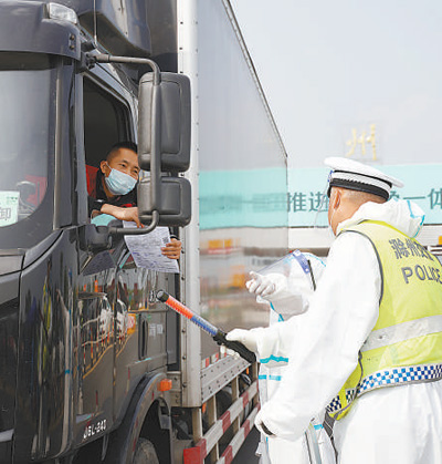 在安徽省滁州东收费站道口,交警引导货车司机通行。 |
