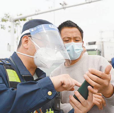 在工作人员手中信号灯的指引下,货车稳稳停入指定区域。拉好手刹,探出车窗,李宾宾按照提示扫码后,手机屏幕上随即显示14天内到达或途经的城市。接货企业的引导员已在道口等候多时,待李宾宾核酸检测采样完成后,将直接引导货车到厂区卸货。