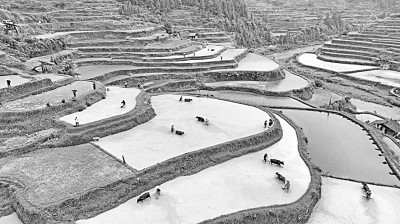 贵州省黎平县尚重镇“百牛同耕”闹梯田。杨晓海摄/光明图片