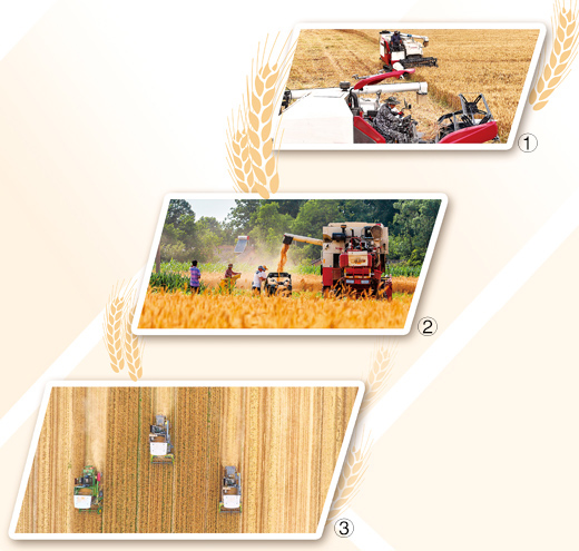 图①:6月3日,在江苏省南通市通州区刘桥镇,多台收割机进行麦收作业。 |