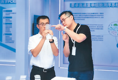 裴颢(右)向到访嘉宾介绍公司的高通量单细胞测序产品。 |
