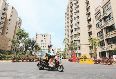 上海市静安区彭浦新村彭三小区五期旧房成套改造近期完成。据介绍,彭浦新村街道已完成彭五、彭七及彭三小区一到五期的旧房改造工程,使2797户居民受益。图为居民骑电动车经过彭三小区五期新建成的居民楼。 |