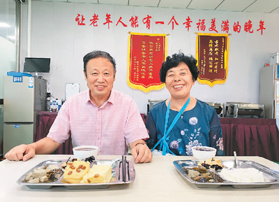 张亚洲(左)和老伴儿在河北省承德高新区滨河社区老年食堂吃饭。 |
