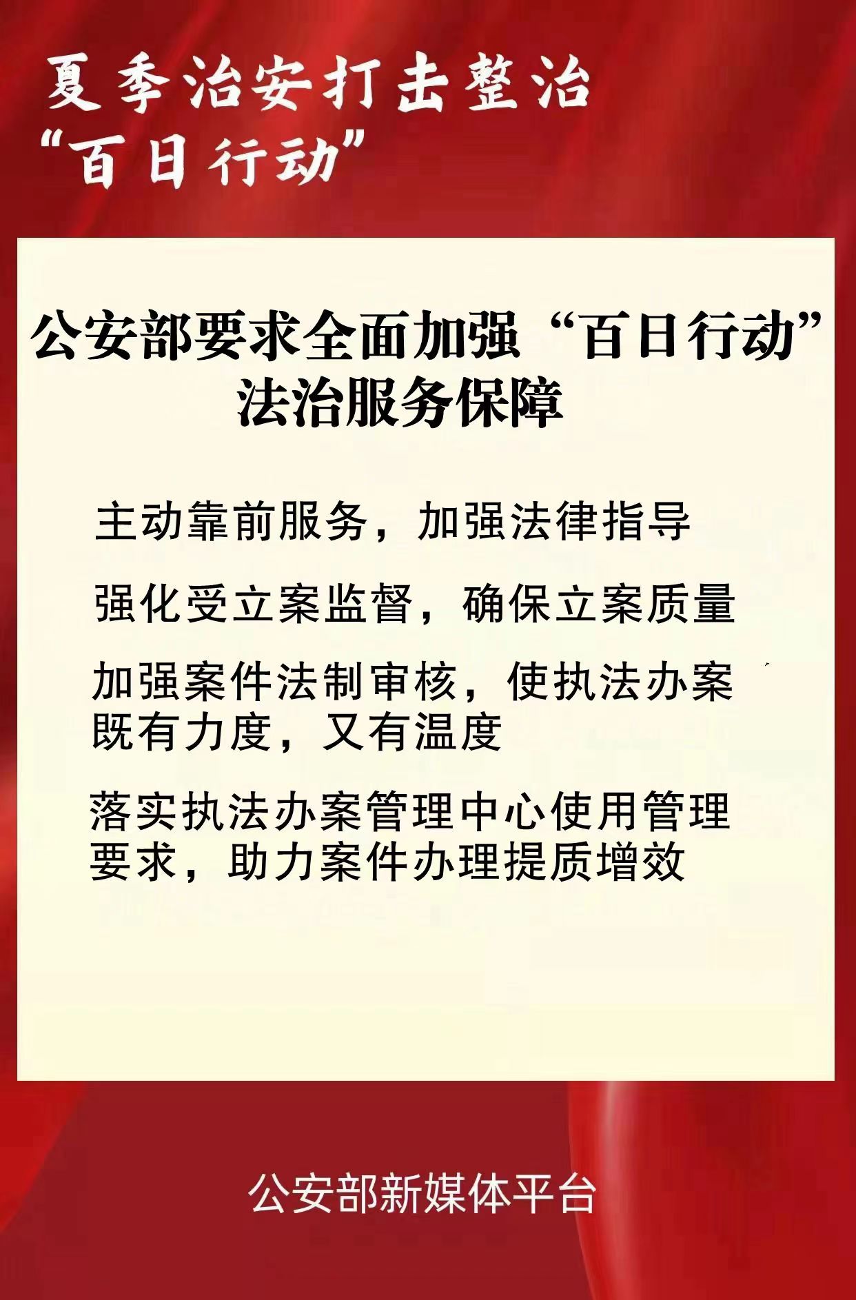 人民网北京8月23日电 (记者郝萍、梁秋坪)记者从公安部获悉,公安部法制局近日下发通知,部署各级公安法制部门提高政治站位,强化责任担当,发挥职能作用,紧紧围绕夏季治安打击整治“百日行动”,全力做好法治服务保障,以实际行动落实严格规范公正文明执法要求,维护社会安全稳定。