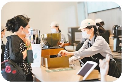 在星巴克西安翠华里手语店,语音识别系统、双面点单屏、手写板以及带编号的手持菜单等设施让点单交流不受语言局限。图为听障咖啡师李莎(右)为顾客制作咖啡。 |