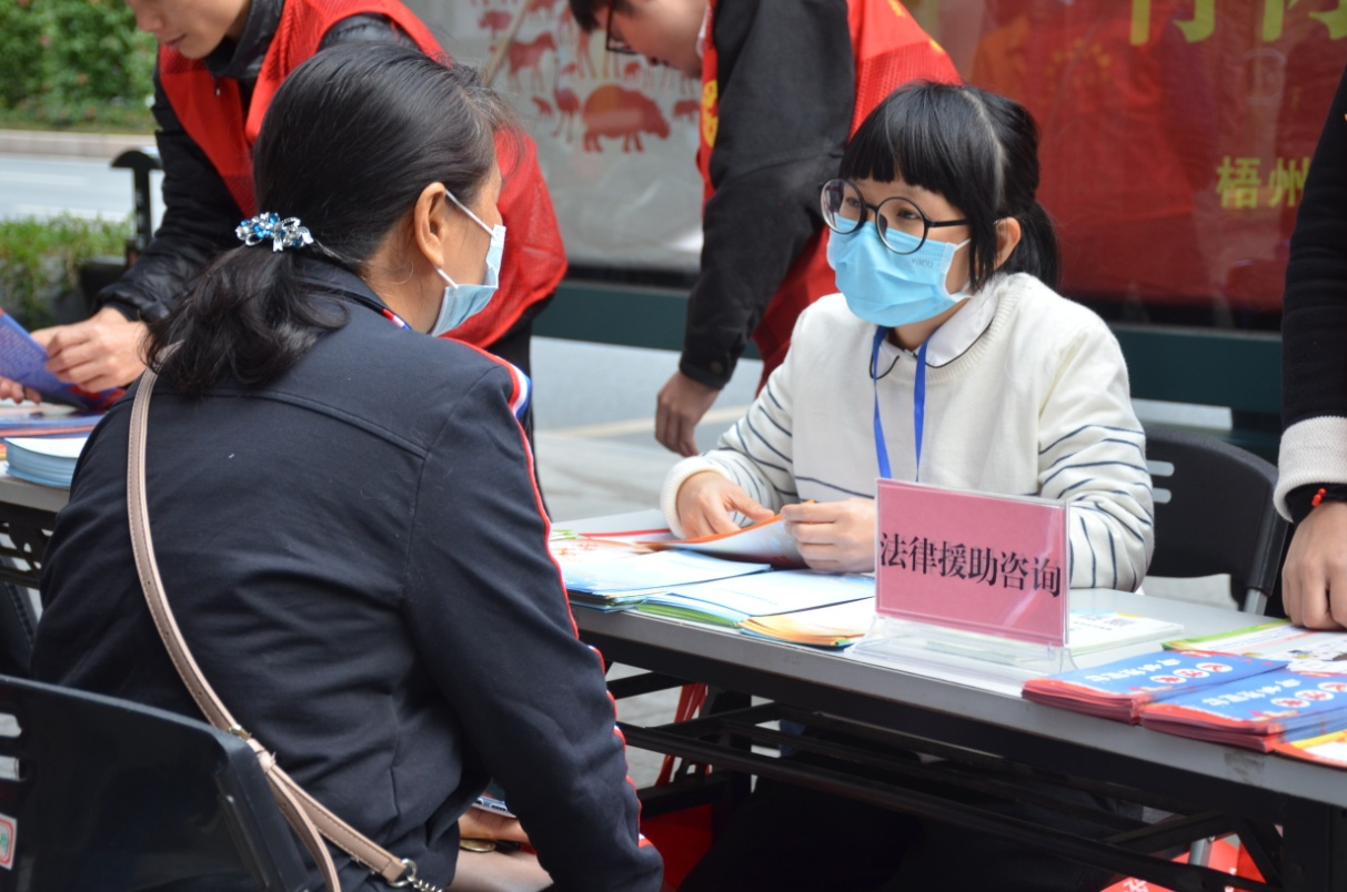 韦金雨(右一)在社区为群众提供法律咨询。受访者供图