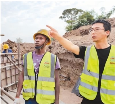 郭治南(右)在指导参与建设马尔卡至班古拉铁路项目的当地工人进行涵洞施工。 |