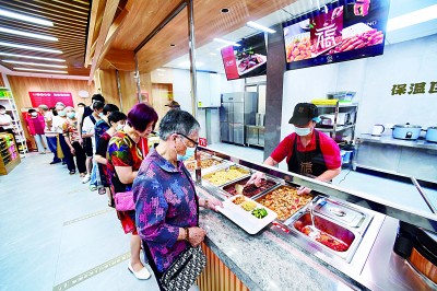 在福州晋安某社区的一家老年食堂,老人排队取餐。新华社发