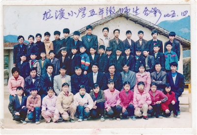 朱森林(一排左一)小学时的合影,他的老师方李长在第二排右五位置。 |