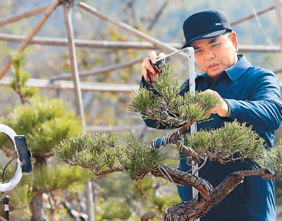 近日,安徽省铜陵市义安区钟鸣镇金山村村民在自家庭院里网络直播销售盆景。 |
