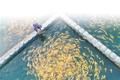 资兴市一名接受过“一户一产业工人”培养工程培训的养殖户在投料喂鱼。 |