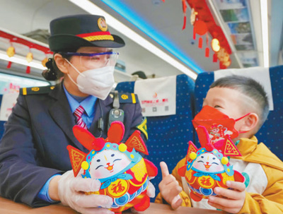 1月7日,兴泉铁路迎来了首个春运。线路的贯通不仅极大便利了沿线百姓的交通出行,还对促进赣闽两地旅游资源开发利用、区域融合发展和乡村振兴起到积极作用。图为在南昌开往泉州的C879次列车上,工作人员为小旅客送上新年礼物。 |