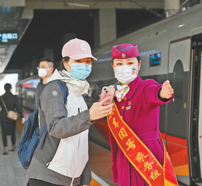 春运开启,成渝高铁“复兴号”智能动车组“共青团号”列车为旅客提供安全课堂、导游、翻译、护理等特色服务。图为“共青团号”乘务组工作人员服务旅客乘车。 |