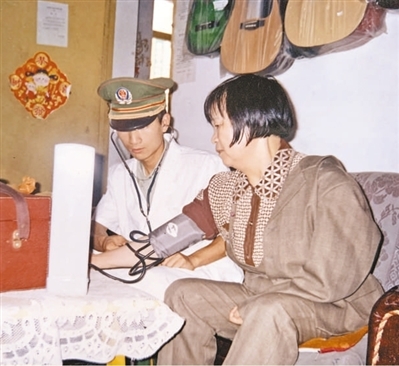 2005年4月,中队卫生员到刘玉珍家中为她测量血压。 |