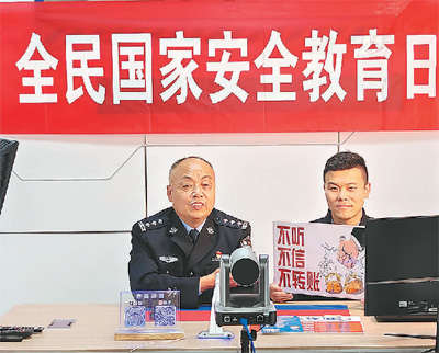 山东省滕州市公安局北辛派出所利用线上直播课的方式,开展国家安全观教育暨普法宣传活动。图为北辛派出所教导员黄金(左一)正在讲解国家安全有关知识。 |